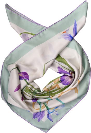 Our Susanna scarf is a piece of timeless elegance that feels as beautiful as it looks. The delicate iris floral design with ribbons adds a soft, feminine touch, while the hand-rolled hems bring a bit of artisanal love to every edge. It's perfect for those of us who appreciate quality and want to add a bit of grace to our wardrobe.
