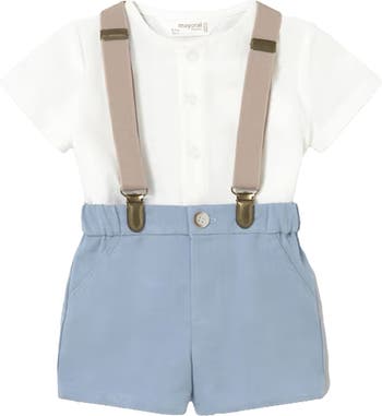 A timeless outfit designed for little gentlemen, this set pairs a crisp button-up shirt with shorts and suspenders. Perfect for parties, family gatherings, or special occasions, it blends classic charm with modern comfort for a stylish look that stands out.