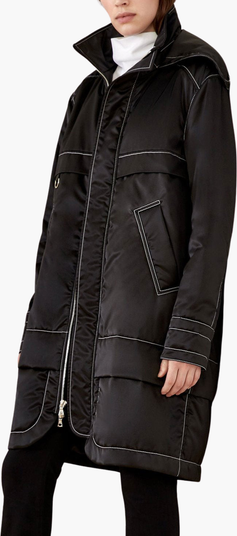- Two-way zip-front closure with metal snap storm placket detail