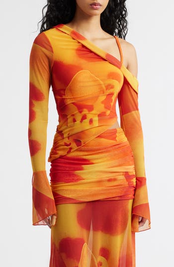 An off-the-shoulder neckline frames this vibrant fitted mesh top styled with elongated flared cuffs that bring fluid movement to the silhouette.