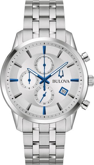 A polished chronograph crafted with a stainless steel case and five-link bracelet offers timeless style defined by modern functionality. Blue hands, hour markers and date display bring bold contrast to the grooved silvertone dial, while the quartz movement and three-sub-eyes boast precision timekeeping and can time events up to 12 hours to the nearest second.