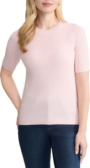 Allover ribbing enhances the texture and close fit of this short-sleeve sweater that layers perfectly from desk to dinner.