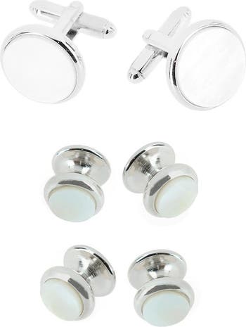 Luminous mother-of-pearl insets further the classic, versatile appeal of this wardrobe-staple set of two cuff links and four matching shirt studs.