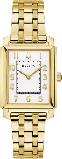 A slim rectangular case and a smooth and bright enamel dial combine with a five-link bracelet for a sophisticated everyday watch.