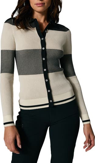 Inspired by the sporty look of vintage ski sweaters, this collared cardigan is knit from soft, silky yarns with narrow ribbed stitches that give this style its figure-skimming fit.