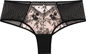 Dark floral embroidery and sheer tulle create dramatic contrast on these cheeky boyshorts finished with a cutout in back.