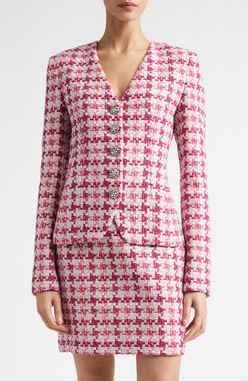 The house’s artisan tailoring comes through in the figure-skimming line of this collarless jacket cut from rich tweed kissed with metallic shimmer. The textured weave and crystal-bedecked buttons catch the light like jewelry, adding a bright finish to a sleek silhouette.