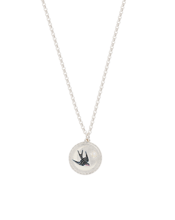 Lean into your free spirit with the Swallow Spirit Guide Pendant Necklace, a graceful symbol of guidance, love and hope. Featuring a hand-painted enamel swallow that soars across a luminous disc of sterling silver-plated brass and is accompanied by the sun and moon, wear this delicate necklace to show off your loyalty and enduring love.