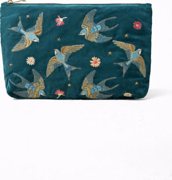 Capturing the elegance of swallow dipping and swooping through the skies, Elizabeth’s design is beautifully-embroidered on rich blue velvet. Keep your beauty bits and daily essentials perfectly organised with this everyday pouch, from morning ritual to travels and beyond.