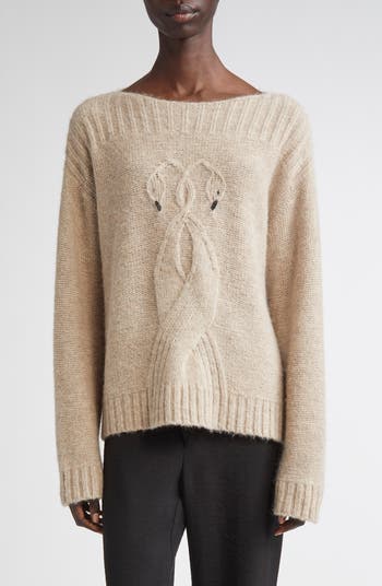 Knit by hand from incredibly soft, plush yarn, this roomy sweater with a slouchy boat neck features the label's take on cable knit in the form of two interlocking swans.