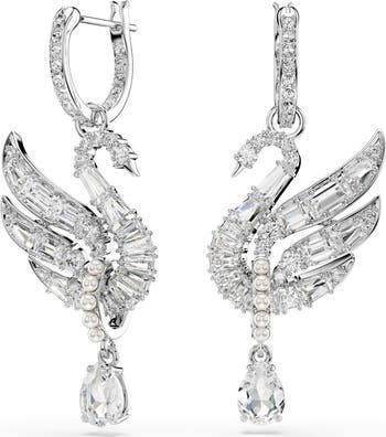 Swarovski's iconic swan logos–decorated with mixed-cut crystals and Swarovski glass pearls– are ready to take flight on these stunning drop earrings.