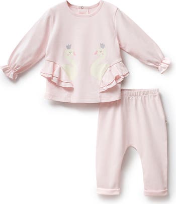 The Swan Ruffle Outfit Set combines sweet elegance with playful details, featuring a soft color hue and delicate ruffle accents. This coordinated set pairs a comfy top with matching bottoms, creating a charming look perfect for twirling and everyday fun. Made from lightweight, breathable fabric, it offers comfort and style for all-day wear.