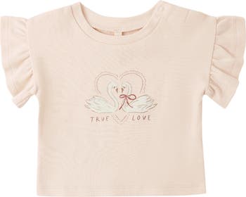 Fluttery sleeves frame a supersoft organic cotton T-shirt centered with paired-for-life swans.