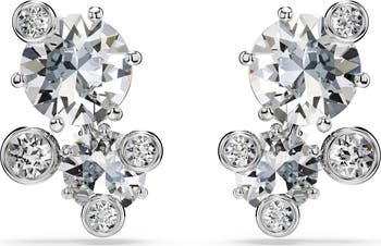 Rounded Swarovski crystals featuring a mix of bezel and prong settings are clustered together to illuminate star-themed earrings designed to twinkle under the lights.