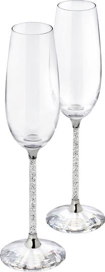 A stem filled with Swarovski crystals plays off the effervescent contents of these elegant champagne flutes set on a sparkly faceted base.