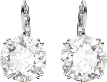 Dazzling round-cut crystal drop earrings in rhodium-plated settings bring glamorous sparkle to any outfit.