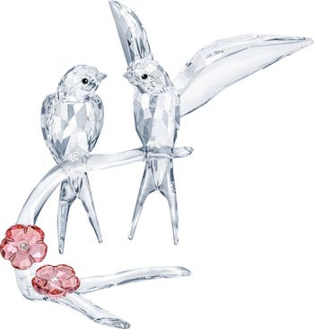A pair of graceful swallows perched on a flowering branch defines this elegant Swarovski figurine crafted from purely clear crystal with pink accents and features over 860 facets. Representing grace, happiness, and love, it would make a beautiful and symbolic gift for any romantic occasion, or a timeless addition to any nature-inspired collection