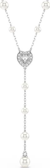 A romantic Swarovski crystal heart with a halo sparkles at the center of a luminous Y-necklace traced by lustrous Swarovski pearl stations.