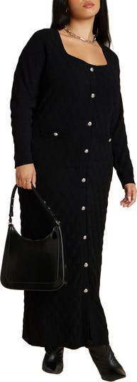 - Sophisticated, streamlined, and slightly sultry, this sweater maxi dress is a timeless addition to your knit lineup. A non-functional button placket draws the eye vertically, while stretch yarn contours with soft structure.