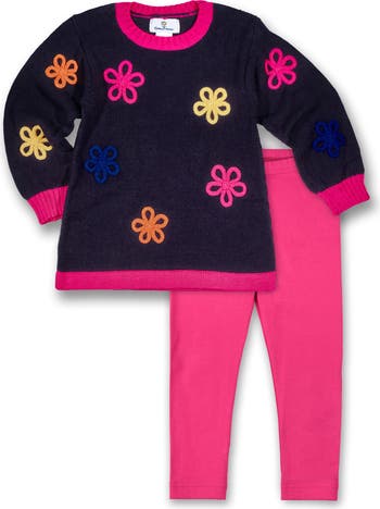 Cozy and cheerful, this two-piece set pairs a navy, fuchsia, and royal cotton sweater knit tunic with coordinating fuchsia jersey leggings. Three-dimensional flowers bloom across the tunic, adding playful texture and heirloom detail to the look. The tunic-length top provides comfortable coverage with a polished finish, while the ankle-length leggings—crafted from a soft cotton-spandex blend—offer stretch for all-day play. Together, they make a versatile set that’s perfect for school days, outings, or thoughtful gifting. Navy, fuchsia, and royal sweater knit, 100% cotton, fuchsia jersey knit, 97% cotton 3% spandex, 3-D flowers, tunic length top, ankle length leggings.