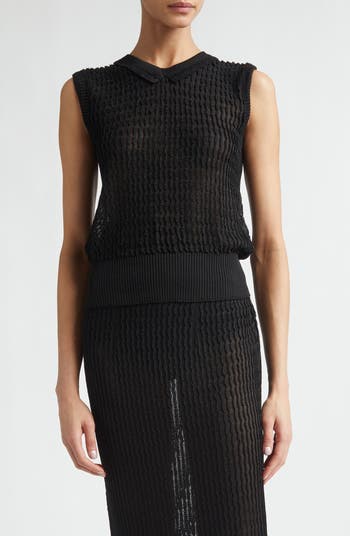 Proof that simple lines can make the boldest statement, this sweater-vest delivers on texture with shimmery vertical ribs meandering down a semisheer ground and split ribbing at the high V-neck.