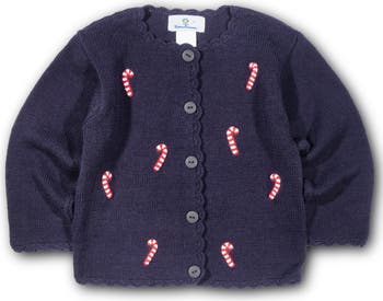 Festive and cozy, this navy cotton sweater is hand knit with red and white candy canes for a cheerful holiday touch. A button-front closure makes it easy to layer, while scalloped edges add a sweet, heirloom finish. Crafted from 100% cotton, it’s soft, breathable, and perfect for keeping little ones comfortable during family portraits, holiday gatherings, and winter celebrations. A picture-perfect holiday layer designed to be treasured for seasons to come. Navy sweater, 100% cotton, hand knit red and white candy canes, button front, scallop edge detail.