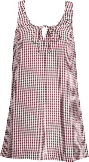 Airy cotton in a classic gingham print shapes this easy shift dress. A scoop neckline with a keyhole and tie detail adds a light, playful finish to the sleeveless silhouette.