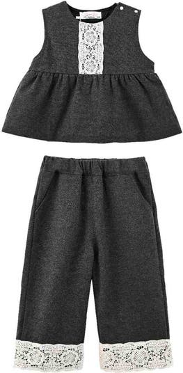 A graceful blend of softness and detail, this gray outfit pairs everyday comfort with delicate lace accents—perfect for playdates or polished outings. Gray swing top with gathered waist and vertical lace panel. Wide-leg pants with elastic waistband, side pockets, and lace-trimmed hem.