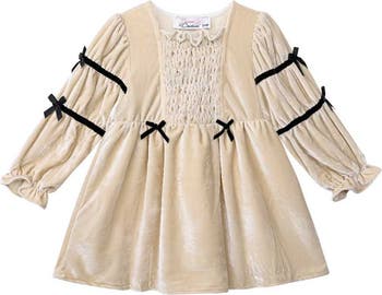 A vintage-inspired charmer with plush texture and delicate detailing. This A-line dress features a smocked bodice, puffed sleeves with black ribbon accents, and a soft lace-trimmed neckline—perfect for special occasions or boutique everyday wear. Smocked front and velvet finish offer timeless elegance. Black ribbon bows and gathered cuffs add playful contrast and charm.
