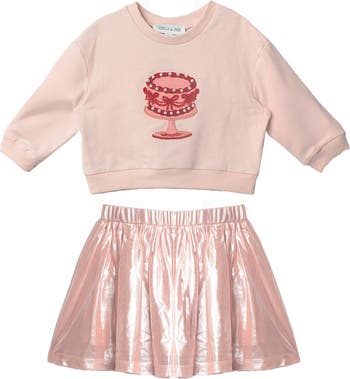 - The Sweet Cakes two piece set adds a playful touch to your girl's wardrobe. This outfit includes a light pink, long-sleeved top with a delightful red and white embroidered cake design and a shiny metallic pink flared skirt. The elastic waistband ensures a comfy fit, making it perfect for parties, special occasions, or simply feeling extra fabulous! Fabric Care Machine Wash Cold