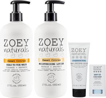 Brighten your child's daily routine with this refreshing collection designed to gently cleanse, hydrate, and protect delicate skin. Infused with naturally uplifting citrus and formulated with gentle ingredients, this bundle helps keep skin feeling clean, soft, and comfortably moisturized while providing reliable sun protection for outdoor play. Set Includes: | Sweet Citrus Head to Toe Wash: A gentle cleanser for both hair and body that washes away dirt while leaving skin clean, soft, and lightly scented with refreshing citrus. Tear-free, gentle pH, sulfate-free, plant-based and naturally scented. | Sweet Citrus Moisturizing Lotion: A lightweight daily moisturizer with a fresh citrus scent to help keep skin soft, smooth, and hydrated throughout the day. | SPF 50 Sunscreen: Broad spectrum mineral sunscreen providing reliable daily sun protection for sensitive skin.