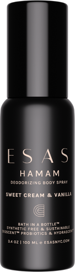 - SCENT DESCRIPTION : This deodorant body spray envelops you in a deliciously rich gourmand experience. The scent opens with a decadent creaminess but remains balanced and wearable throughout the day. Warm notes of vanilla and caramelized sugar create an indulgent, yet sophisticated aroma, while a subtle buttery undertone adds to its irresistible appeal. This best-seller captivates with its rich, gourmand allure, offering a scent that feels both luxurious and comforting without being overpowering—a perfect treat for everyday indulgence. HOW IT WORKS : Inspired by the ancient Hamam ritual, Esas Hamam Deodorizing Body Spray is your "bath in a bottle," designed to purify, cleanse, and refresh. Rooted in a tradition that dates back to the 14th century, this unique body spray brings the essence of Roman baths into the modern day. Scientifically formulated with the purest ingredients, including Certified Organic Botanical Alcohol*, Witch Hazel, Coconut-Derived Glycerin*, and Esas DeoScent™ Sugarcane Ferment*, it effectively cleanses, deodorizes, and refreshes your skin wherever you go. Enriched with hydrating hyaluronic acid, vitamin E, and antioxidant-rich grape leaf tincture, this spray not only purifies but also nourishes, leaving your skin feeling revitalized and lightly scented. Perfect for an on-the-go refresh, it's the ultimate solution for staying clean, refreshed, and fragrant throughout your day.