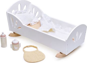 Little ones will love rocking their dolly to bed with this adorable set that includes wooden toy accessories like a bottle and sippy cup.