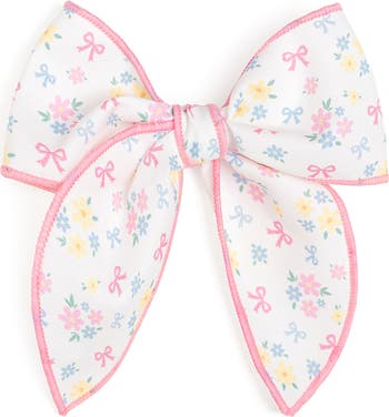 This soft fabric bow clip features a delicate pastel floral print, perfect for adding a sweet, gentle touch to any hairstyle.