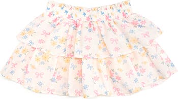 Ready for fun, this adorable tiered skort features a comfy smocked waist and a cheerful springtime print of delicate flowers and sweet pastel bows, perfect for play and twirling.