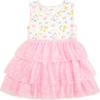 This darling dress combines a sweet, soft printed top with three dazzling layers of pink tulle, making every twirl a magical moment.