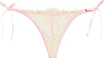 Peekaboo heart lace enhances the romance of this flirty thong sweetened with ribbon ties at the sides.