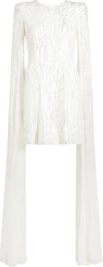 Striking and contemporary, this embellished designer dress combines structured tailoring with fluid movement. The sculpted shoulders and sleek silhouette create a powerful, elongated line, balanced by a cascade of chiffon draping from the sleeves. Vertical detail with a couture finish.