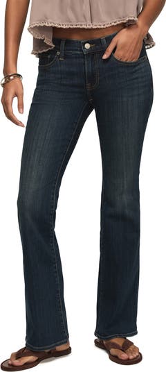 Slim through the hips and flared below the knee, these low-stretch jeans feature a mid-rise waist and full-length legs for a casually dramatic look.