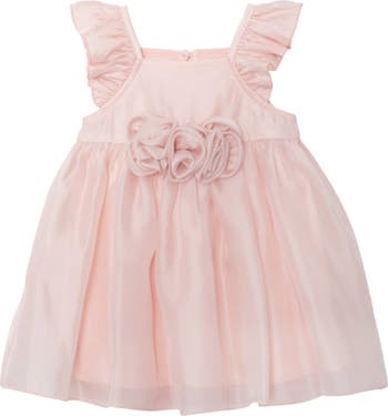 Picture her twirling with joy at her next celebration in this beautiful light pink dress. Designed for special moments, it features sweet flutter sleeve shoulder straps and three beautiful rosettes at the waist. This soft and airy organza dress is perfect to wear all day. Fabric Care & Content Machine Wash Cold | Line Dry | Do Not Bleach 100% Polyester