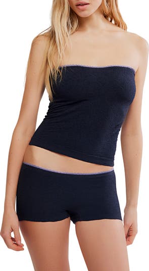 A lace-inspired jacquard pattern brings dimension to this shoulder-baring tube top that's slightly cropped.