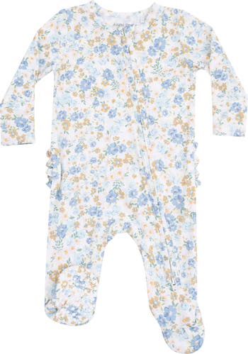 A floral print and back ruffles sweeten this long-sleeve footie made from soft jersey and secured by a two-way front-zip closure for easy changes. Optional fold-over cuffs help prevent scratches, while grippy feet offer light traction.