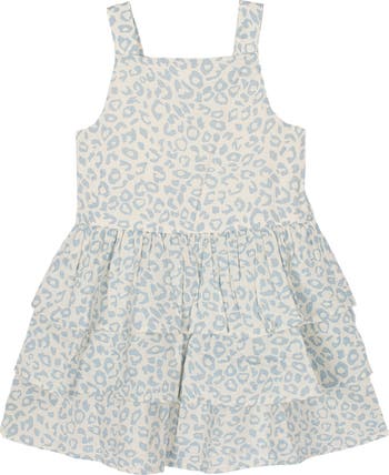 This girls' dress features a soft ivory base with a delicate blue leopard print for a stylish and playful touch. Designed with a square neckline and wide straps, it offers a comfortable fit. The tiered skirt adds volume and movement, making it a perfect choice for both casual outings and special occasions.