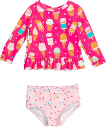 Signature ruffles lend playful energy to this precious two-piece swimsuit with a long-sleeve rashguard and coordinating bottoms.