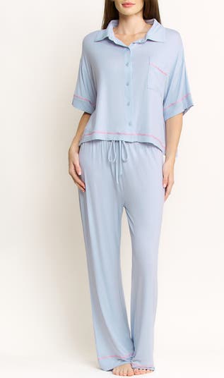 Contrast stitched trim sweetens a soft set of pajamas that pairs a roomy button-up top with matching drawstring pants.