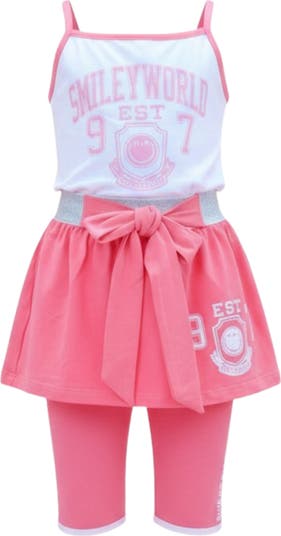 Smiles meet sporty in this standout SmileyWorld three-piece set made for your little trendsetter. Featuring a soft crop tank, bow-waist skirt, and built-in biker shorts, this look is all about fun, flair, and everyday motion. The iconic “97” graphic adds retro-cool energy while the pink-on-pink palette keeps it sweet and stylish.