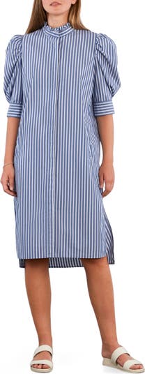 Brisk stripes run up and down a breezy high-low cotton shirtdress framed by elbow-length puff sleeves and touched with frill at the neck.
