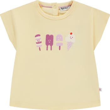 This solid toned short sleeve top features a center graphic of smiling summer desserts and snap enclosures at the back of the garment.