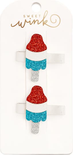 Bright, bold, and full of sparkle, this glittery bomb pop hair clip set adds a sweet pop of red, white, and blue fun to every summer look.