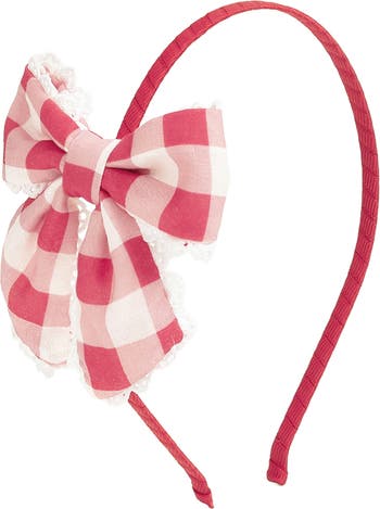 - Features: Red gingham bow with scalloped lace edges